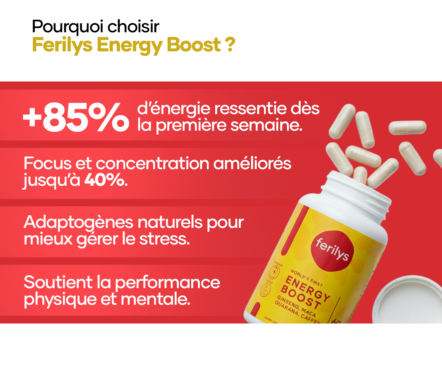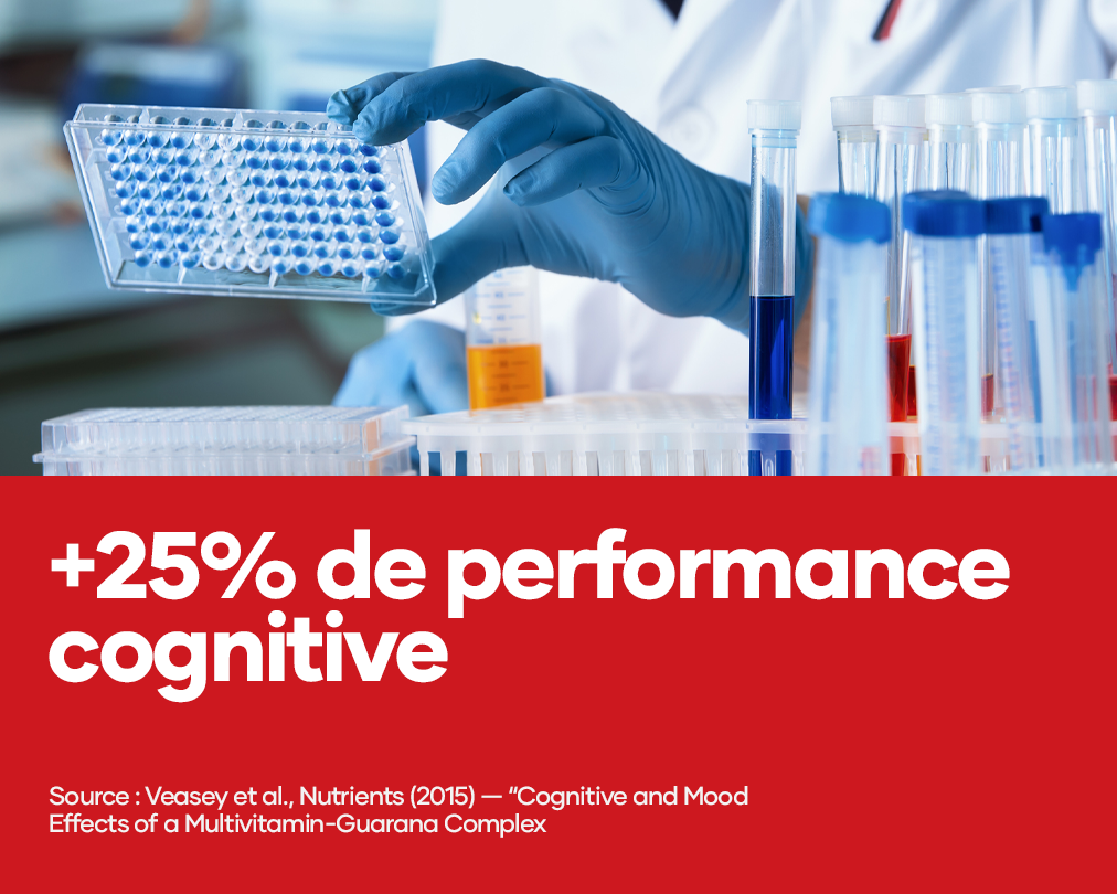 Basé sur des études cliniques sur le ginseng, la maca et la caféine naturelle.